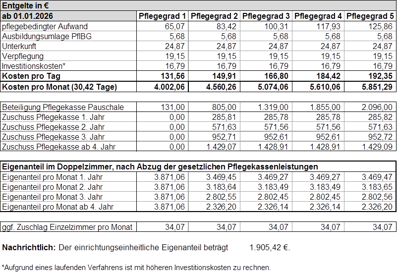 Alle oben genannten Pflegesätze werden regelmäßig neu mit dem Landschaftsverband Westfalen-Lippe und der Arbeitsgemeinschaft der Pflegekassen in NRW vereinbart. Daher können wir für die Aktualität der jeweils genannten Beträge keine Gewähr geben. Druckfehler und Irrtümer sind vorbehalten.